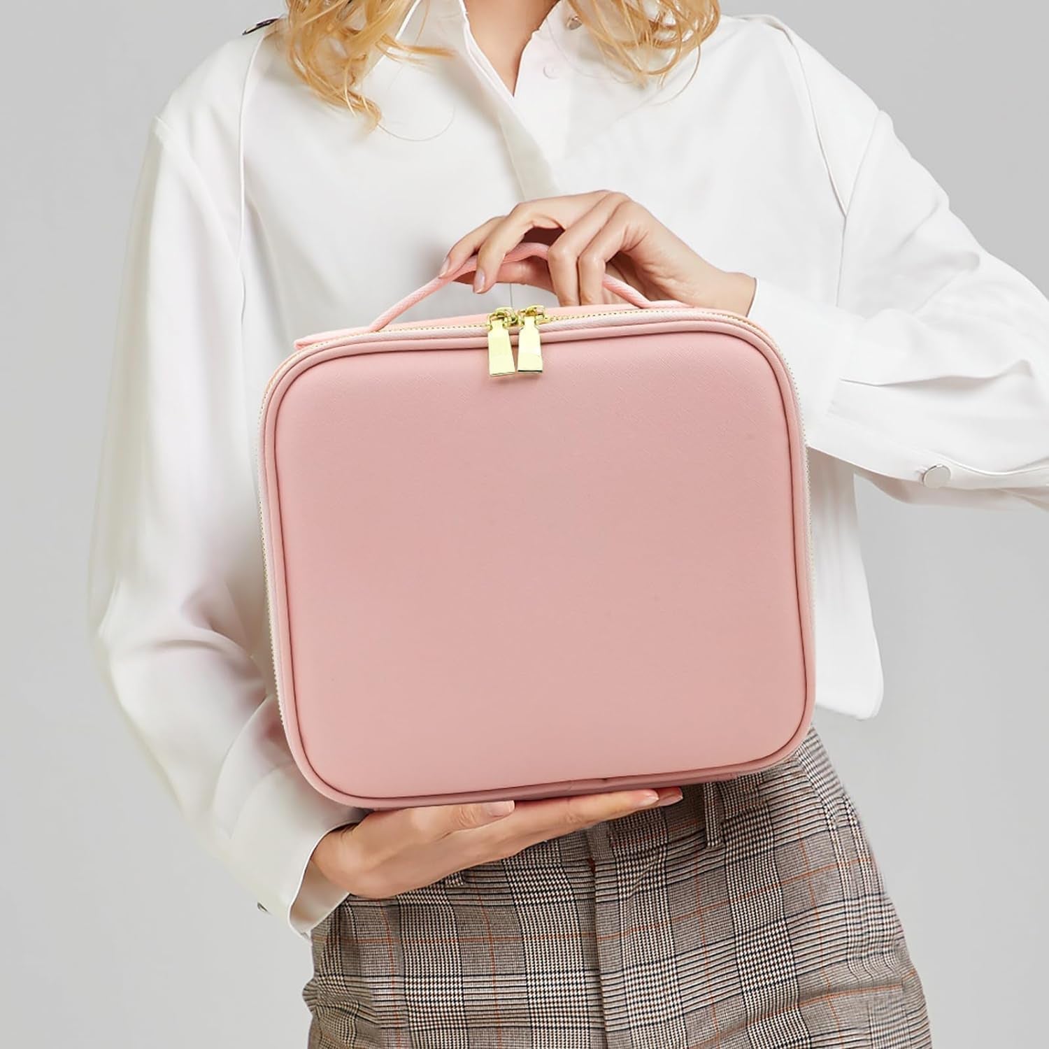 This LED light makeup organizer box is the ultimate blend of utility and elegance. Crafted for makeup enthusiasts and frequent travelers, it features a large storage compartment with adjustable dividers to neatly organize cosmetics, skincare bottles, and beauty tools. The built-in rectangular touch sensor mirror with LED lighting provides optimal brightness for precision makeup, even in dim surroundings. A transparent zippered pouch under the lid keeps brushes and slim accessories safe and accessible. Its sleek design and USB rechargeable mirror make it a must-have for on-the-go beauty routines.